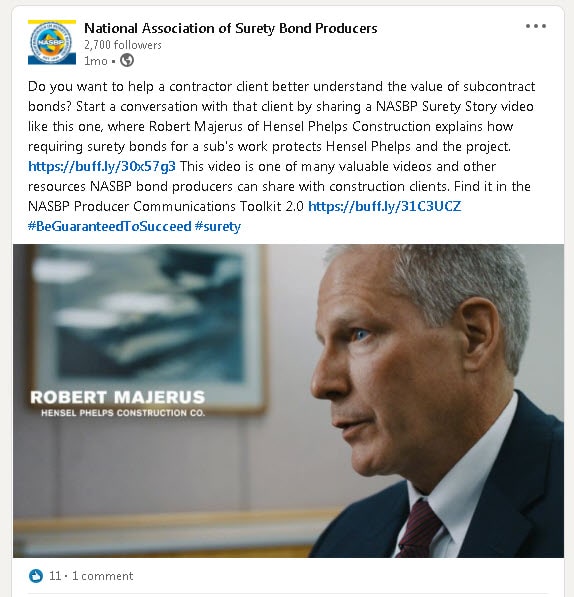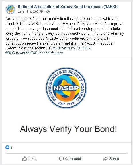 If you haven’t already checked these posts out, we encourage you to make a note each Friday to look at the NASBP posts on its social media channels where you will find posts about the NASBP “Be Guaranteed To Succeed” Campaign or a NASBP Producer Communications Toolkit 2.0 resource. Please like, share, and comment on the posts like these, pictured here, to help support the NASBP PR Campaign and its positive messages that highlight the value of the surety product and how it helps stakeholders #BeGuaranteedToSucceed.