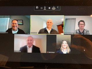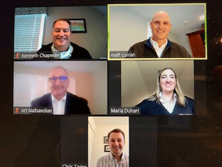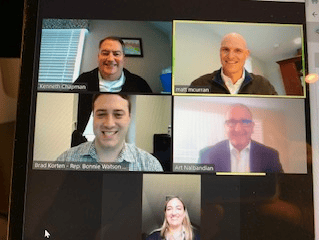 U.S. Representative Mikie Sherrill’s (D-NJ-11) Legislative Assistant Chris Taylor in a virtual meeting with NASBP Affiliates Kenneth Chapman of IAT Surety, Matt Curran of SOMPO International, Art Nalbandian of Chubb Surety, and Maria Duhart of AXA XL.