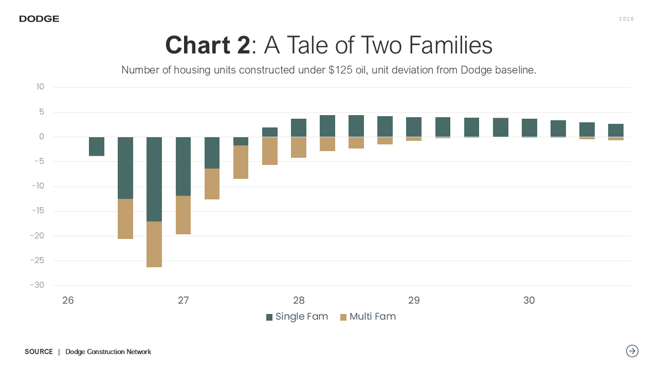 As military activity in the Persian Gulf region stretches into its third week, the prospect of a significant oil price shock seems like a meaningful possibility. Being a large input to construction activity, an increase in the oil price will slow down construction, but how much and for how long? The economics team at Dodge explored two scenarios to give some sense of the impact on the construction industry and the surety business that supports it. In our worst-case scenario total construction activity is about 2% lower than our current baseline assumptions; meaningful but not catastrophic.